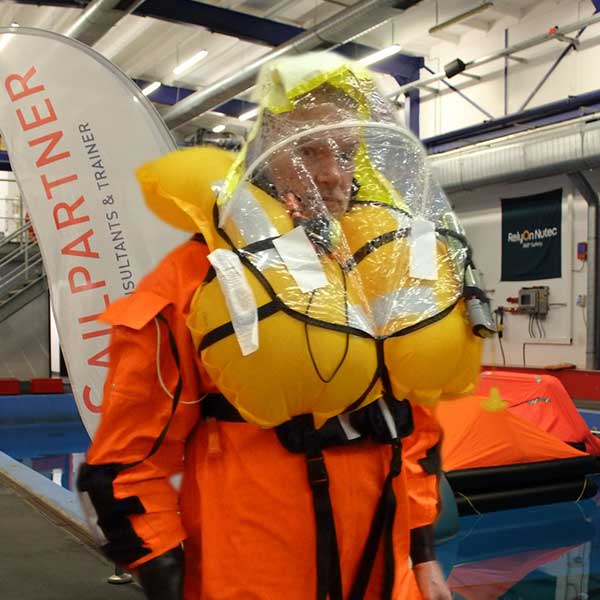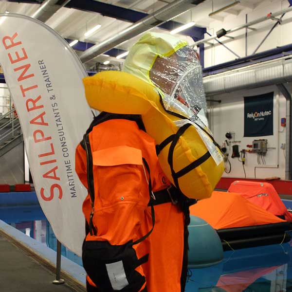 Die Spraycap bietet nicht nur Schutz vor Gischt, sondern minimiert auch die Auskühlung des Körpers über den Kopf. Sie lässt sich mit geübten Handgriffen schnell über den Auftriebskörper der Rettungsweste ziehen.