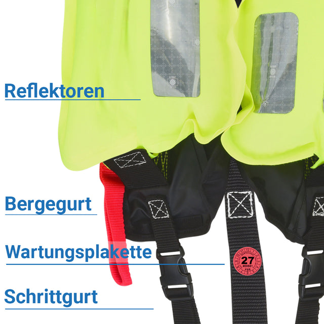 Dieses Schaubild zeigt die wichtigsten technischen Merkmale von Rettungswesten – je nach Modell können Funktionen und Ausstattung variieren.